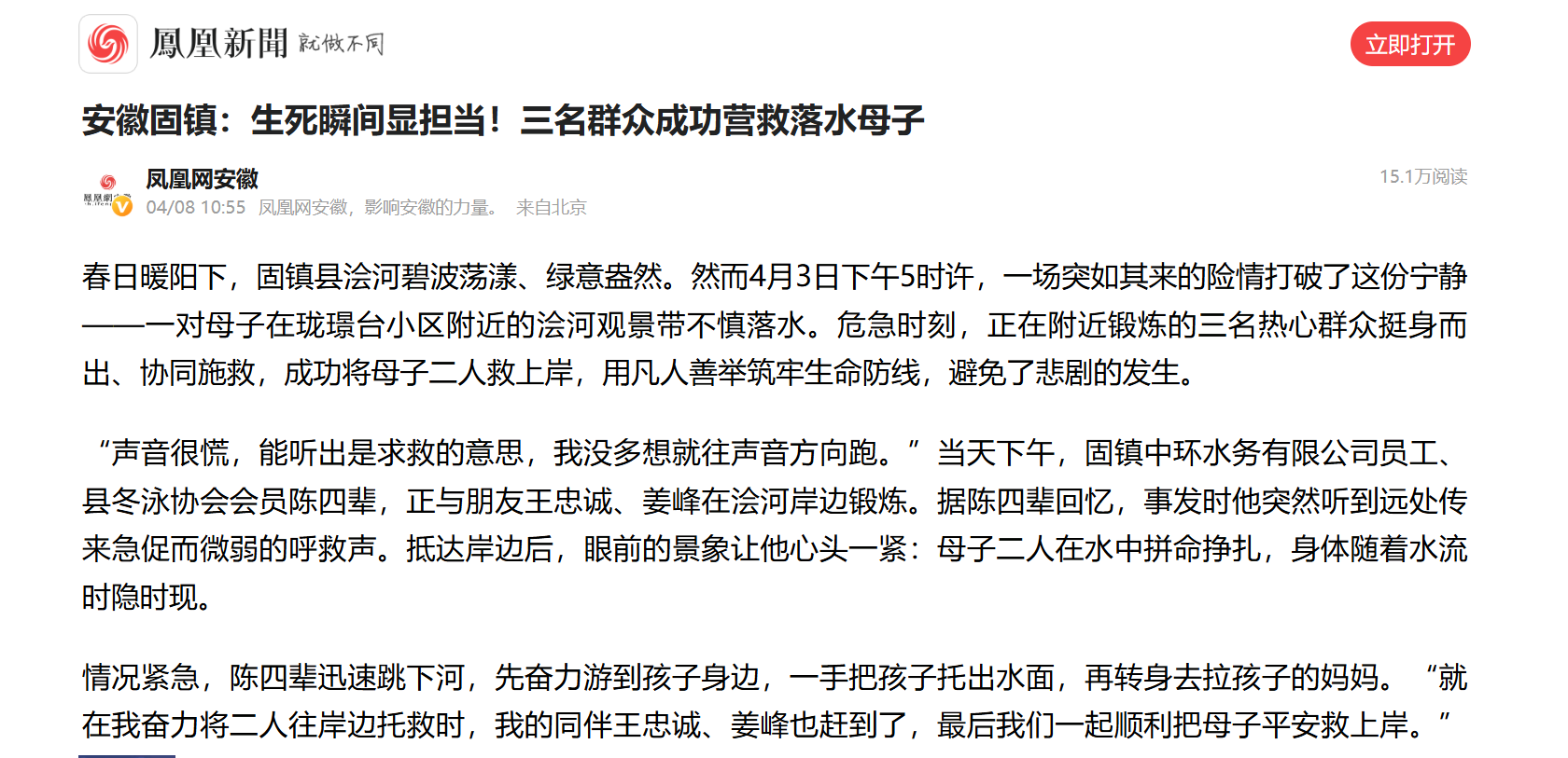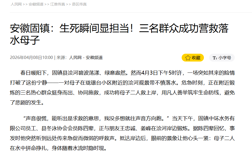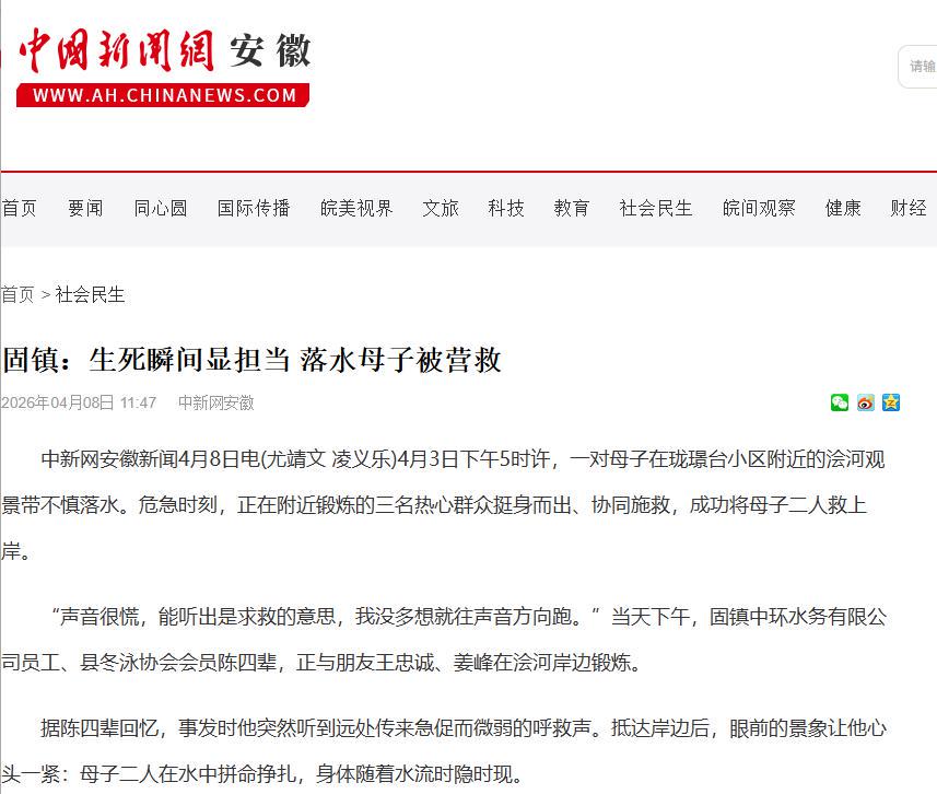 部分主流媒體報(bào)道截圖 2026年4月3日下午,安徽蚌埠固鎮(zhèn)縣一對母子在澮河河畔觀景時不慎落水,命懸一線。陳四輩是固鎮(zhèn)冬泳協(xié)會會員,當(dāng)時剛結(jié)束訓(xùn)練上岸休整。聽到遠(yuǎn)處傳來急促的“救命”聲,他立刻起身,向事發(fā)點(diǎn)飛奔百米。岸邊濕滑難行,他顧不上危險(xiǎn),縱身躍入冰冷河水中,奮力托起落水女子。同時,他發(fā)現(xiàn)女子不遠(yuǎn)處還有一名年幼男孩,孩子此時已體力不支。時間就是生命,陳四輩一手緊緊拽住女子胳膊,一手奮力將孩子護(hù)在懷中,拼盡全力向岸邊游去。此時,另一名游泳者下水協(xié)助,最終合力將這對母子安全救上岸。