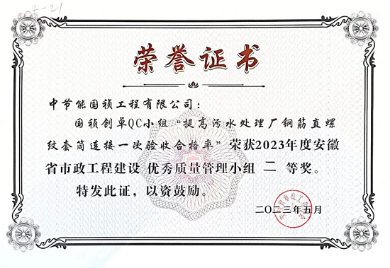 中節(jié)能國禎工程公司QC小組編寫的《提高污水處理廠鋼筋直螺紋套筒連接一次驗收合格率》憑借圖文并茂、邏輯性強的特點,在眾多成果中脫穎而出,獲“優(yōu)秀質(zhì)量管理小組二等獎”的優(yōu)異成績,這也是工程公司首次取得該項榮譽。